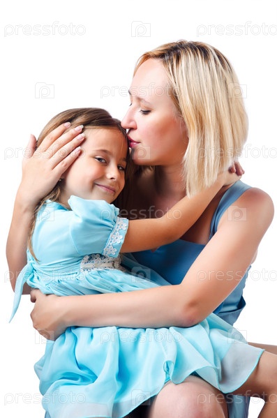 Счастливые мать и дочь на белом фоне