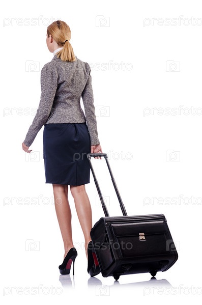 Деловая женщина с чемоданом на белом фоне