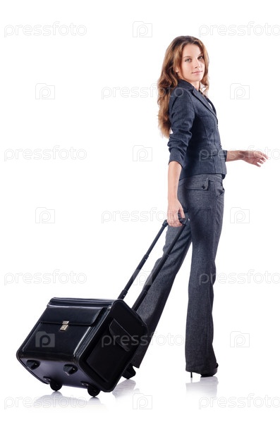 Деловая женщина с чемоданом на белом фоне