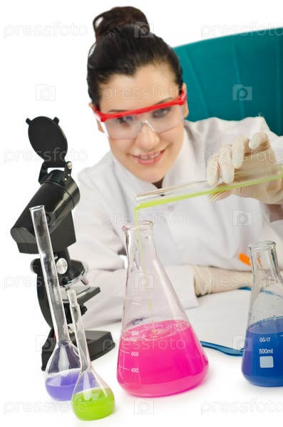 Женщина-химик в студии на белом фоне