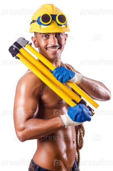 Мускулистый строитель с инструментами в руках