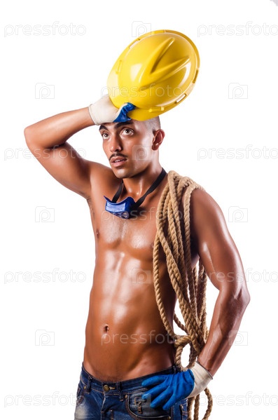 Мускулистый строитель с инструментами в руках