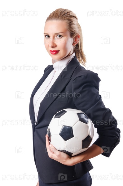 Бизнес-леди с футбольным мячом на белом фоне