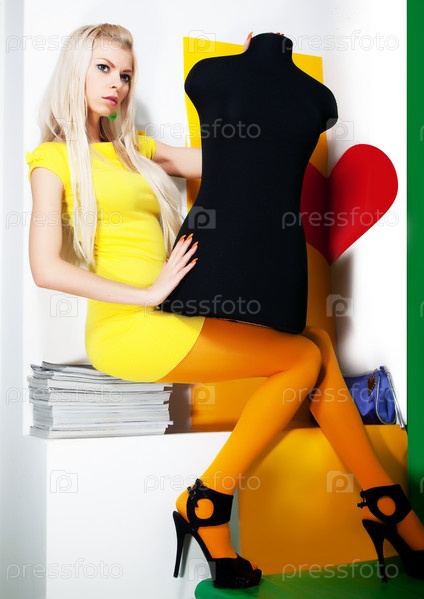 Сидящая красивая блондинка с манекеном