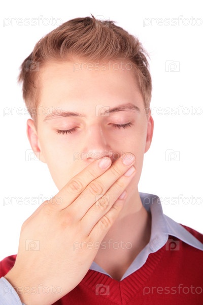 Молодой человек с закрытыми глазами прикрывает рот