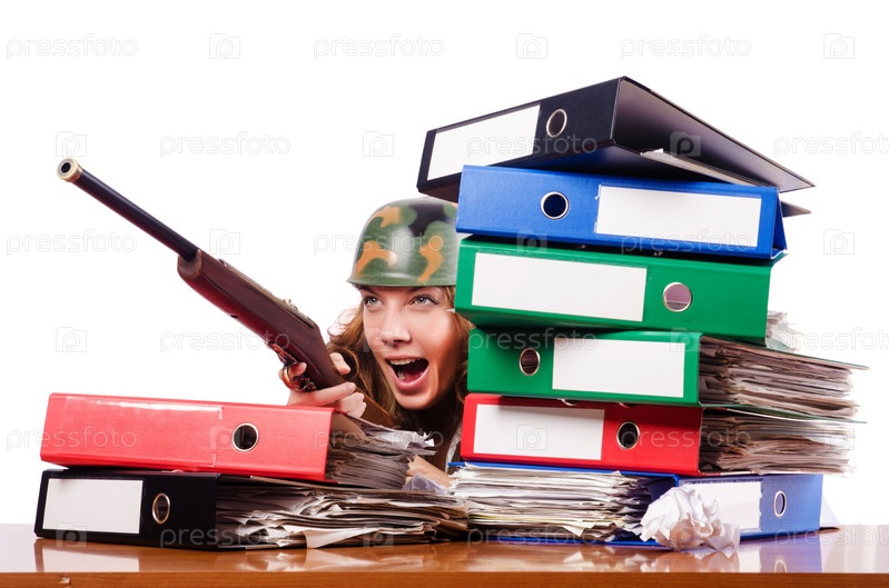 Женщина с ружьем за офисным столом