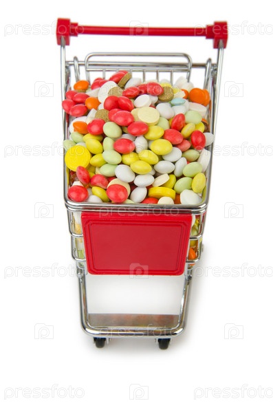Корзина с кучей разноцветных таблеток