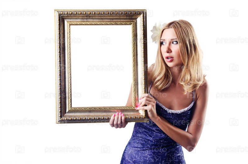 Женщина с фоторамкой на белом фоне