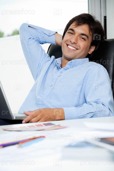 Расслабленной дизайнер интерьера с ноутбуком