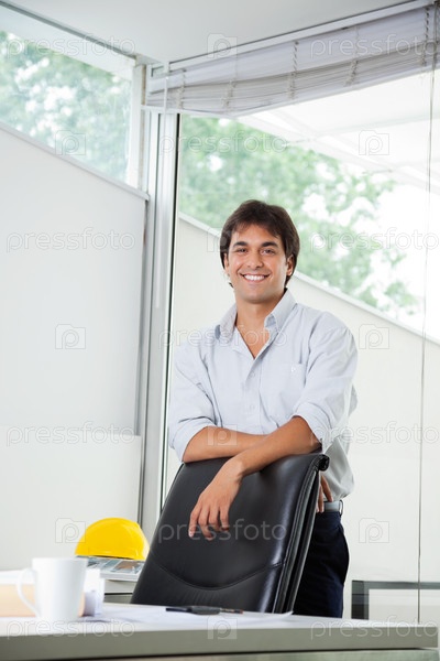 Архитектор стоит у стула в офисе