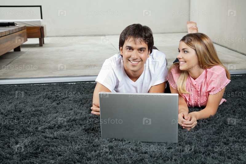 Молодая пара с ноутбуком лежит на ковре