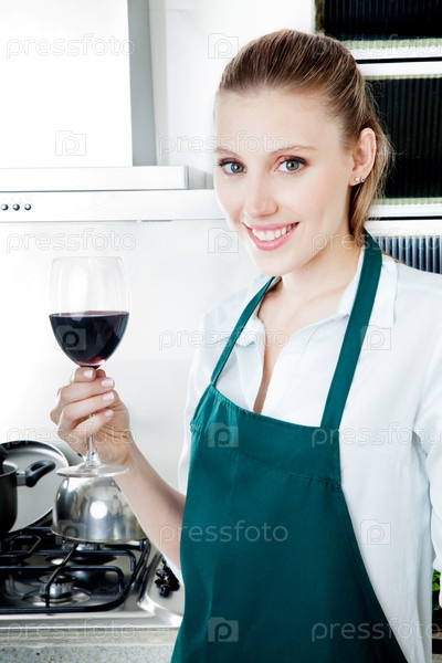 Женщина с красным вином на кухне