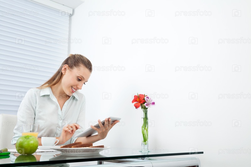Бизнес-леди работае на планшетном компьютере за завтраком