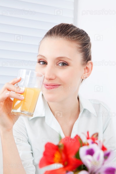 Молодая женщина пьет сок