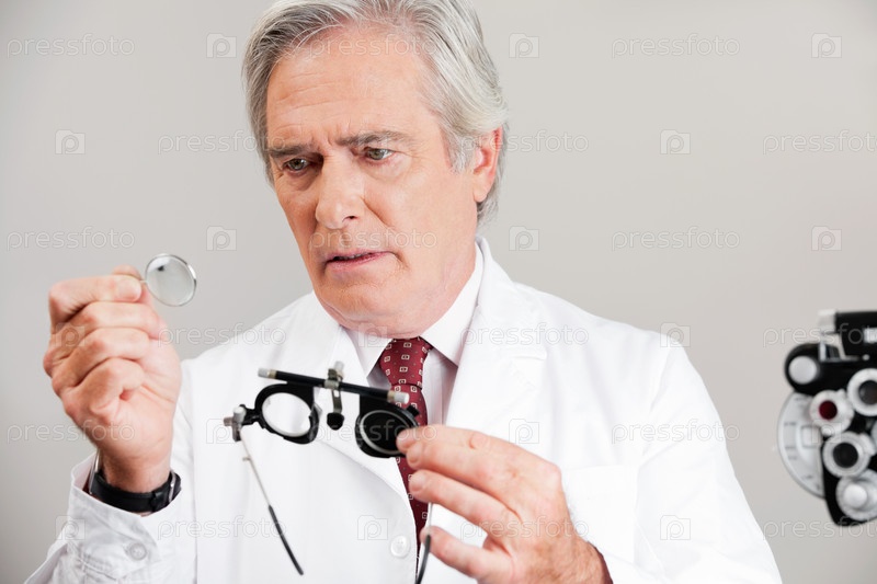 Окулист изучает очки для проверки зрения