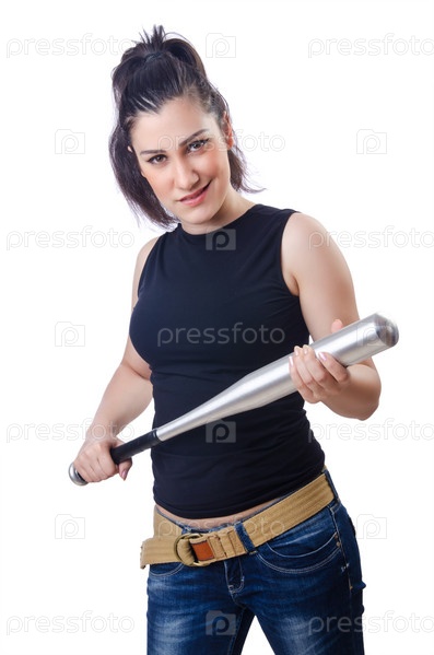 Криминальная женщина с битой на белом фоне