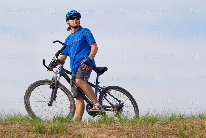 Велосипедист в шлеме и очках на фоне неба