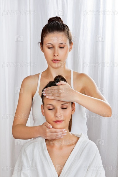 Массажистка делает массаж головы женщине