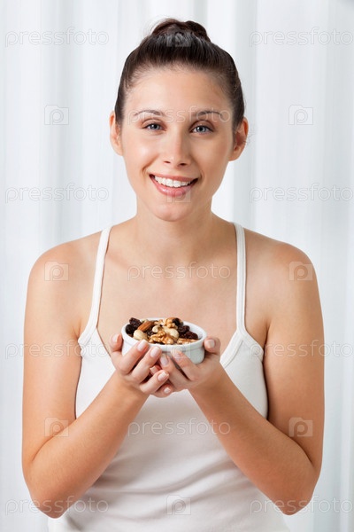 Женщина, держащая чашку сухих фруктов
