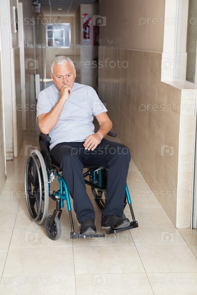 Грустный пожилой мужчина сидит в инвалидной коляске