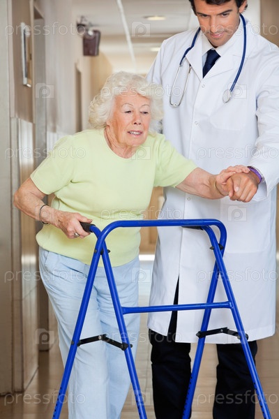 Доктор помогает пациенту использовать ходунки