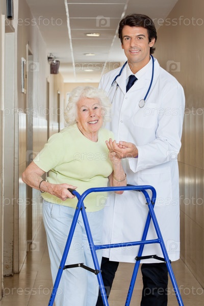 Доктор помогает пациенту использовать ходунки