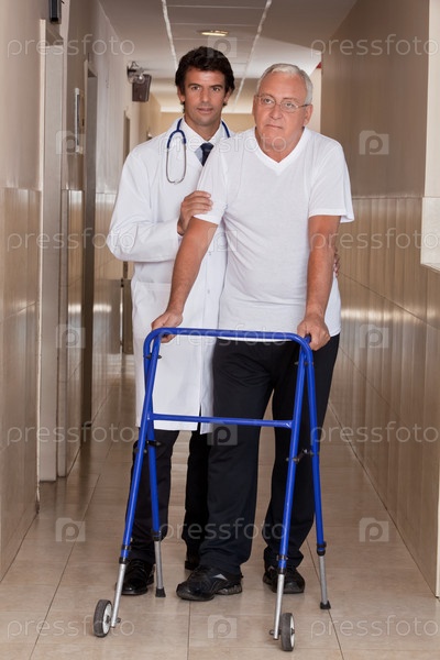 Доктор помогает пожилоиу мужчине с его ходунками