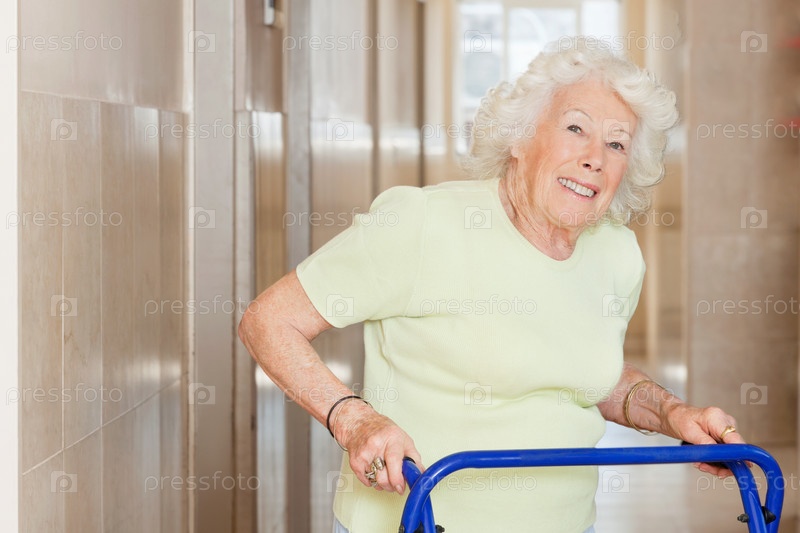 Старая женщина пользуется ходунками