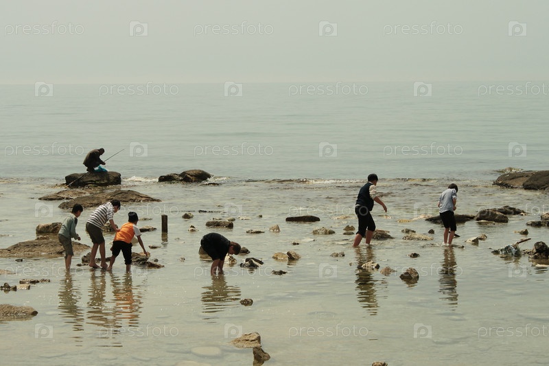 Мальчики на пляже ловят крабов