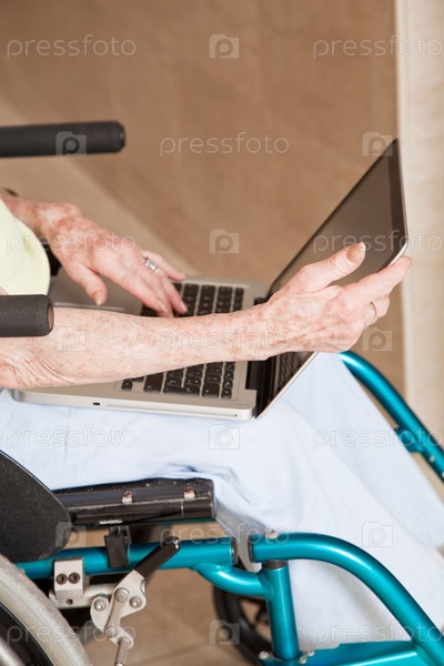 Пожилая женщина в инвалидной коляске с ноутбуком