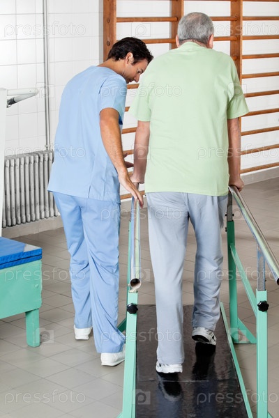 Терапевт помогает пожилому мужчине ходить с поддерживающими брусьями