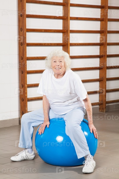 Пожилая женщина сидит на фитболе