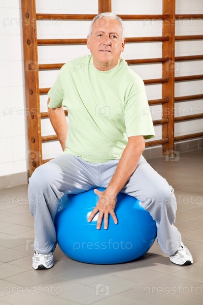 Пожилой мужчина сидит на фитболе