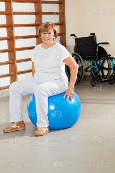 Пожилая женщина сидит на фитболе