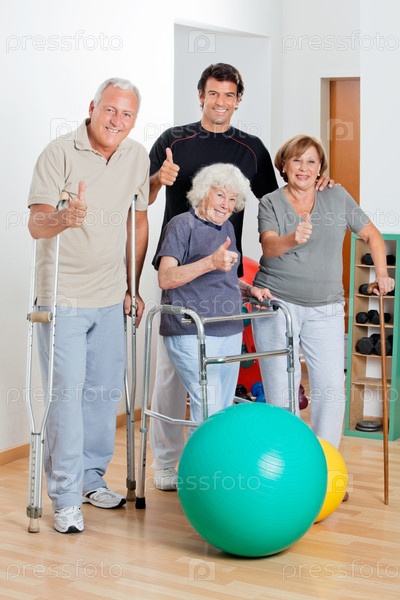 Пожилые инвалиды и тренер показыват знак "все отлично"