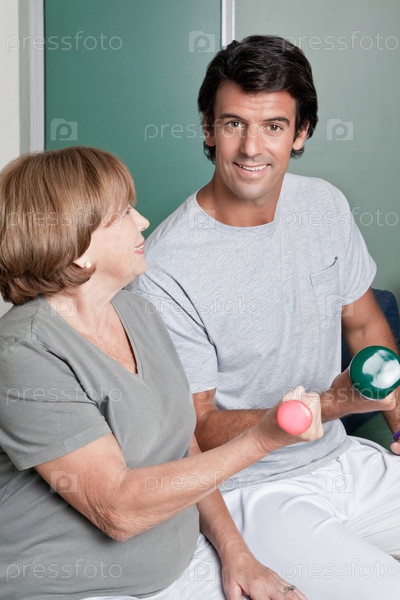 Молодой преподаватель и женщина занимаются фитнесом