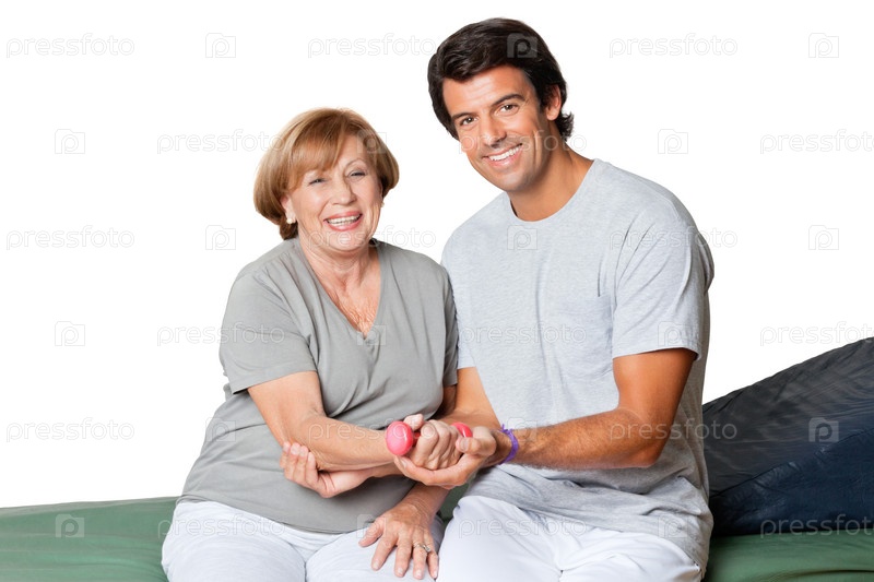 Терапевт помогает тренировать мышцы, фиксируя локтевой сустав