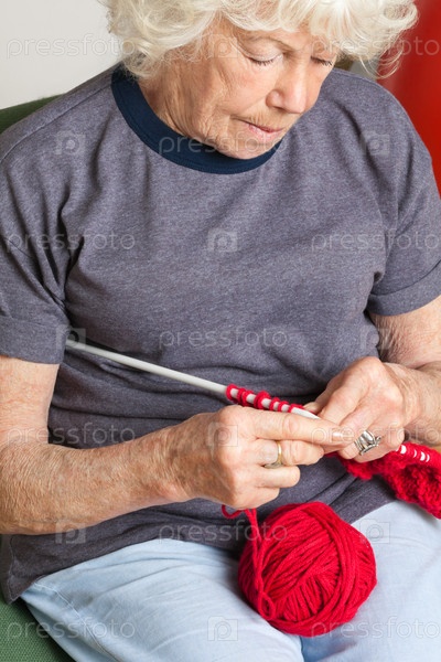 Пожилая женщина вяжет из красной пряжи