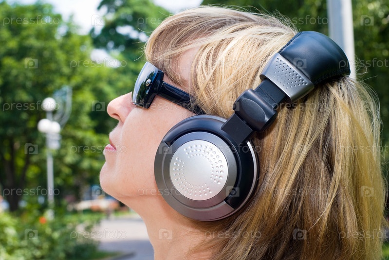 Молодая девушка слушает музыку в парке