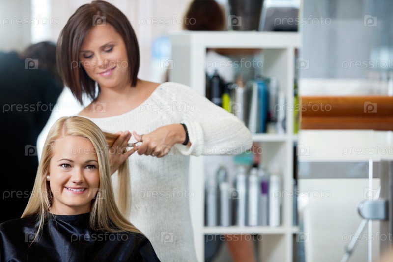 Парикмахер делает стрижку женщине