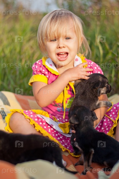 Маленькая девочка играет со щенками