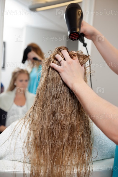 Парикмахер сушит волосы клиента