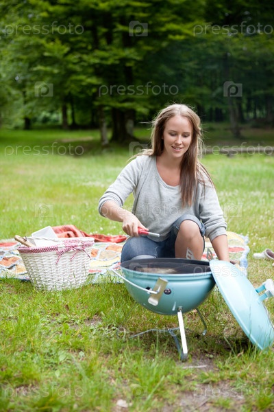 Молодая женщина разжигает барбекю