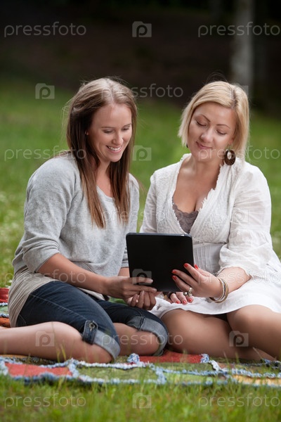 Друзья с цифровым планшетом в парке