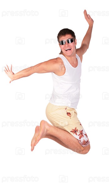 Веселый молодой человек в пляжной одежде и солнечных очках прыгает