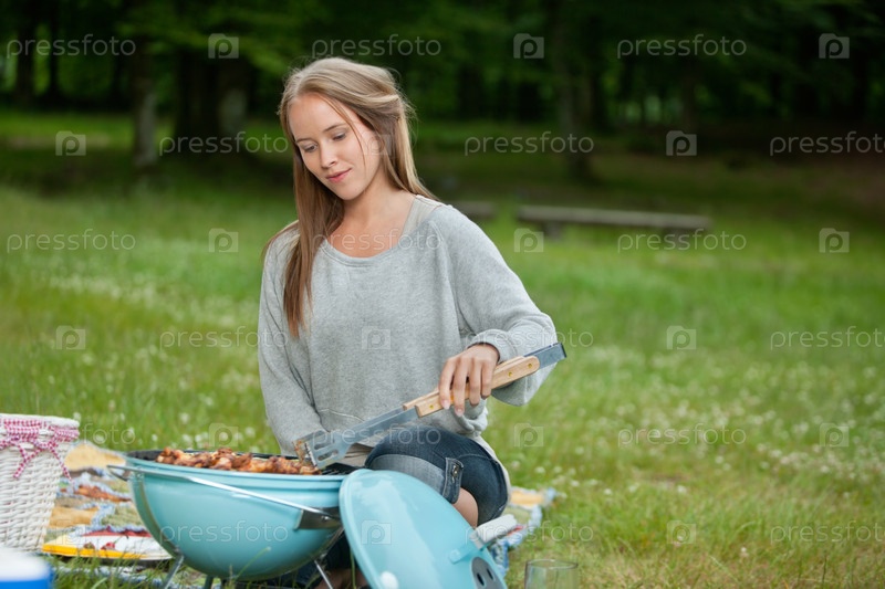 Женщина готовит еду на барбекю