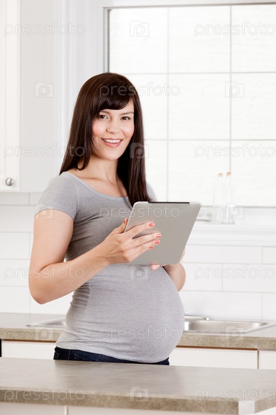 Красивая беременная женщина использует цифровой планшет