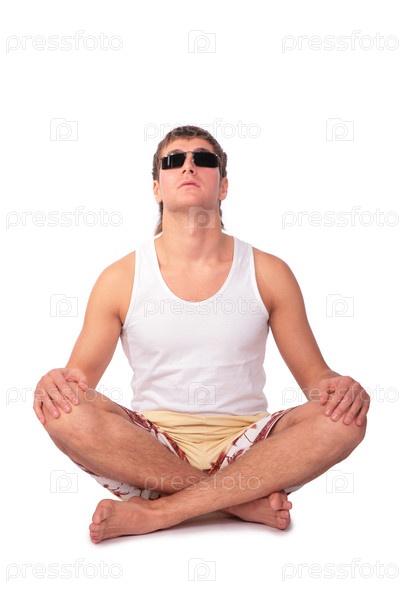 Молодой человек в солнечных очках, майке и шортах сидит в позе лотоса