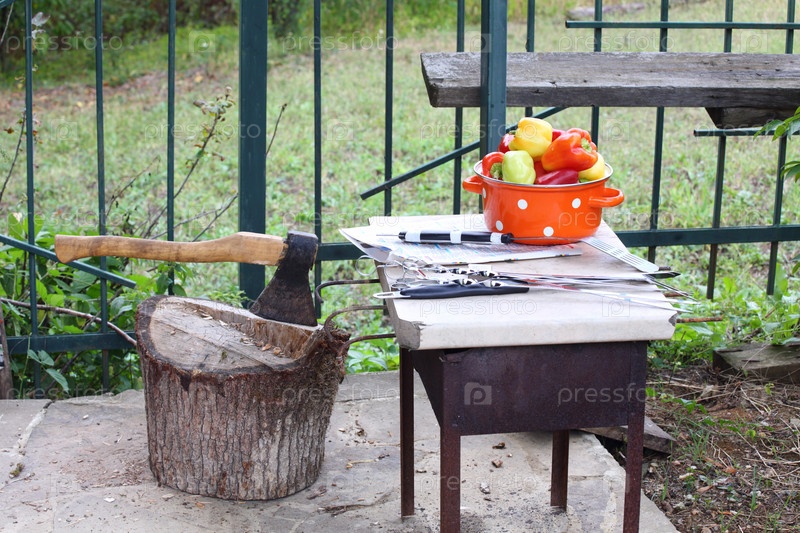 Кастрюля с перцем и шашлык на деревянном столе, топор в пеньке