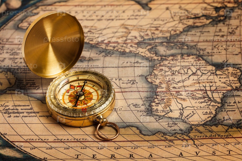 Старый золотой компас на древней карте